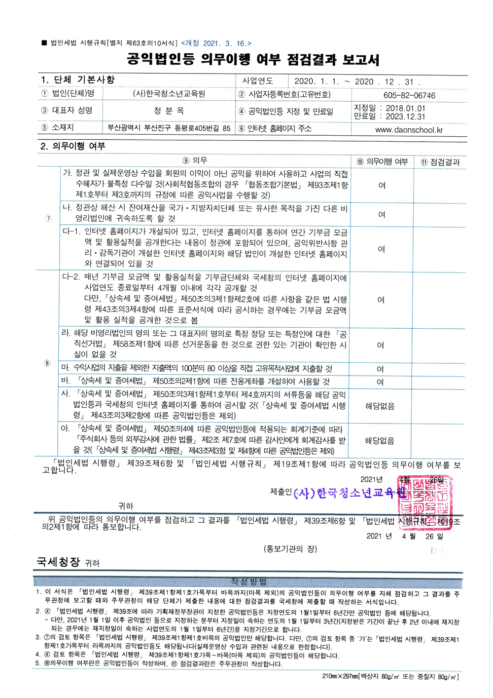2020년 연간 기부금 모금액 및 활용실적 명세서