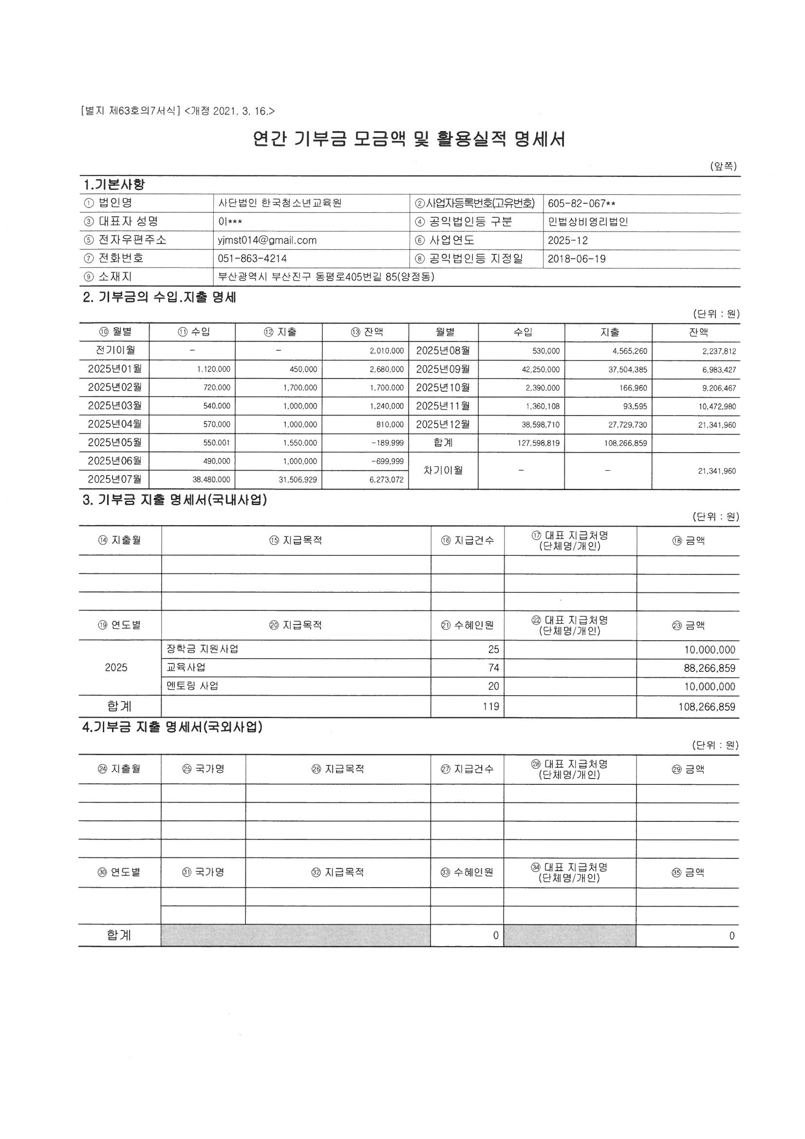 2025년 연간 기부금 모금액 및 활용실적 명세서