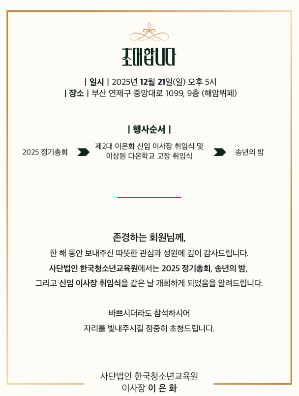 2025년 사단법인 한국청소년교육원 정기총회, 신임이사장 취임식, 다온학교장 취임식 안내