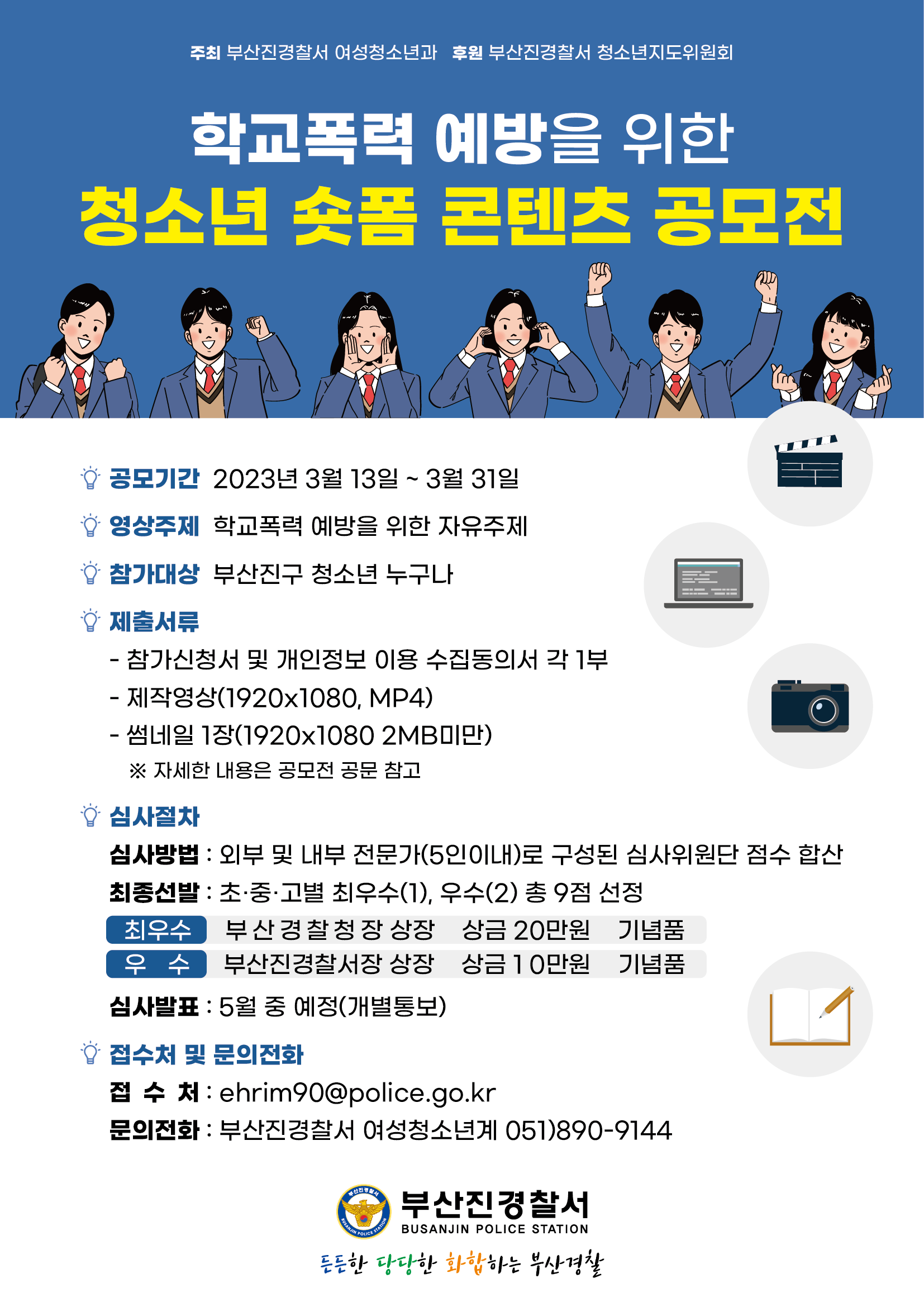학교 폭력 예방을 위한 청소년 숏폼 콘텐트 공모전 개최(부산진경찰서 주최)